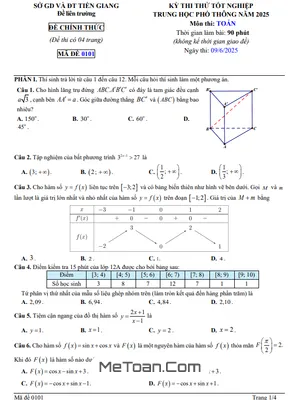 MeToan.Com trân trọng giới thiệu đến quý thầy, cô giáo cùng toàn thể các em học sinh đề thi thử kỳ thi tốt nghiệp Trung học Phổ thông năm 2025 môn Toán. Đây là đề thi do liên trường Trung học Phổ thông trên địa bàn tỉnh Tiền Giang tổ chức. Kỳ thi thử này đã diễn ra vào ngày 09 tháng 06 năm 2025, nhằm giúp các em học sinh có cơ hội cọ xát, làm quen với cấu trúc và độ khó của đề thi chính thức, từ đó đánh giá được năng lực hiện tại và có kế hoạch ôn tập hiệu quả hơn cho kỳ thi quan trọng sắp tới.
